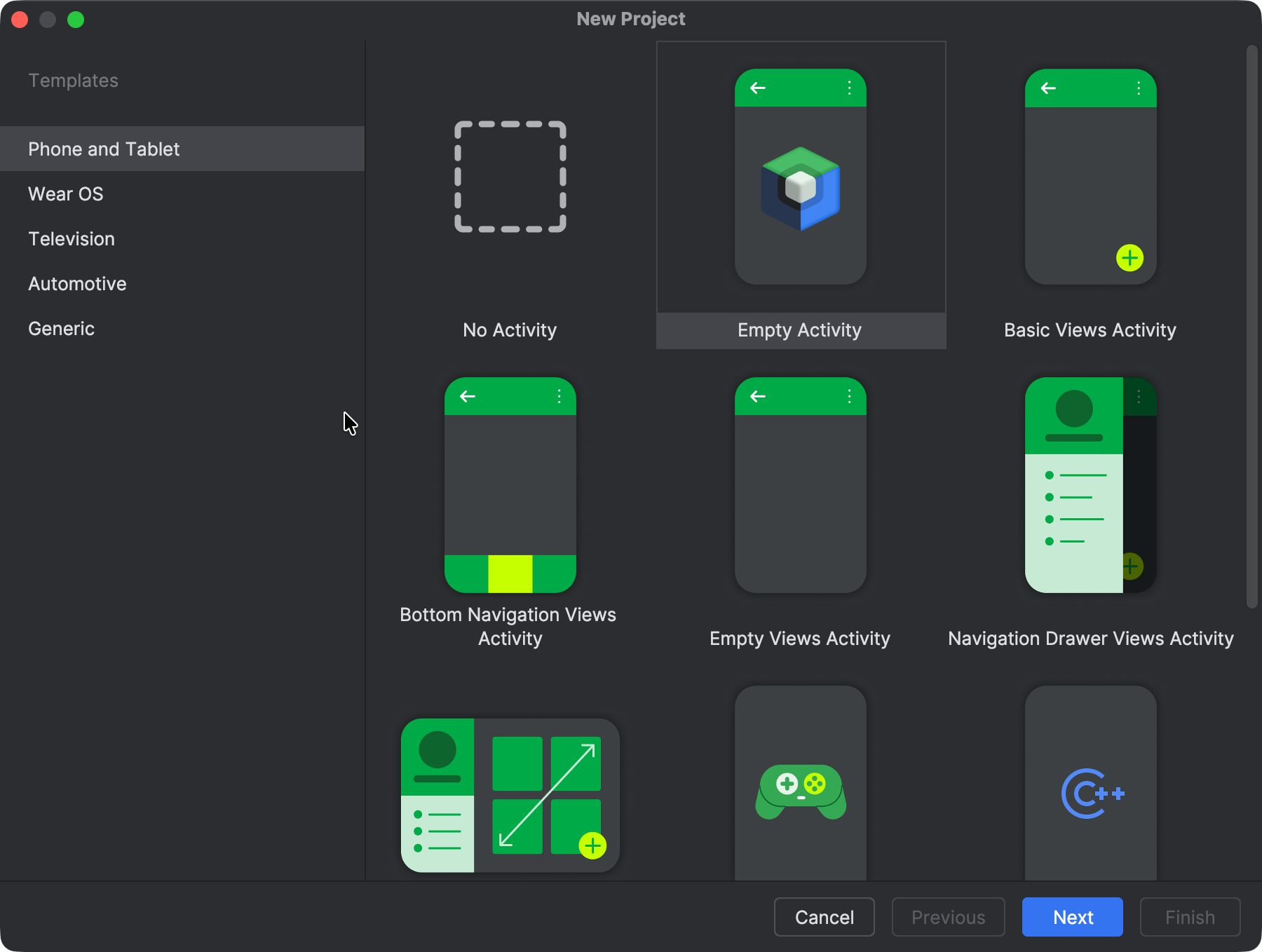 Once installed, we'll go through some setup which installs the Android SDK for us. When setup, we'll create a new project based on an Empty Activity template. A word of caution, there are several templates that are based on the older "Views" approach, which is an XML-based approach of building your UI. While this is still a valid way of building Android apps, Google has recommended folks use Jetpack Compose over the XML approach. Be sure to chose the templates that do no include "Views".